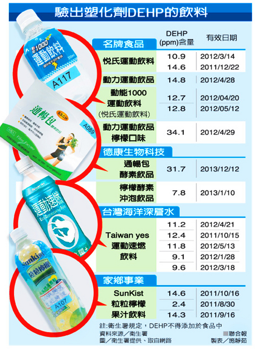 致癌塑化劑 DEHP 混充食品添加物,造成名牌食品、台灣海洋深層水、家鄉實業、德康生技等4家廠商共 16 件飲料檢體受害,其中包括知名的悅氏運動飲料、Taiwan yes 運動速燃飲料與 SunKist 粒粒檸檬果汁飲料,不只果汁、飲料遭汙染,就連果醬、益生菌粉等產品也下架回收。,