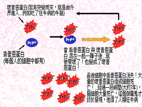 讓牛和人的頭腦空洞化,漸漸失智的元兇,既不是細菌,也不是病毒,而是蛋白質 (prpsc ,壞普恩蛋白 ) !細胞中原本具備的是正常的 prion 蛋白質 (prpc,乖普恩蛋白 ) 。