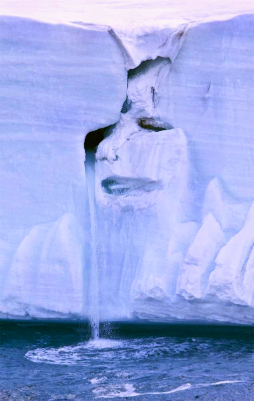 地球溫度像爐火般不斷攀升,北極冰山跟著冒汗,一層一層不斷剝落,麥可諾倫在挪威的最大的奧斯特佛納 Austfonna 冰冠,拍到一張令人毛骨悚然的照片,融化的冰水在冰冠上雕刻出一張人臉,有眼睛、鼻子、嘴巴,悲傷的臉龐還流下一行淚珠。