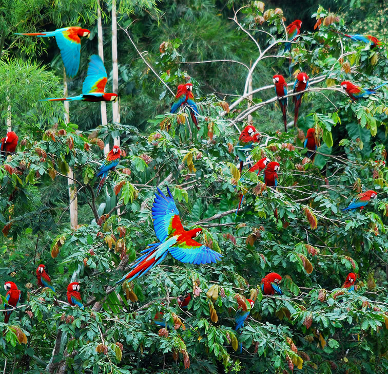 紅綠金剛鸚鵡,學名 Ara chloropterus,是色彩最漂亮、體型最大的鸚鵡之一,面部佈滿了條紋,有點像京劇中的花臉臉譜,興奮時可變為紅色。