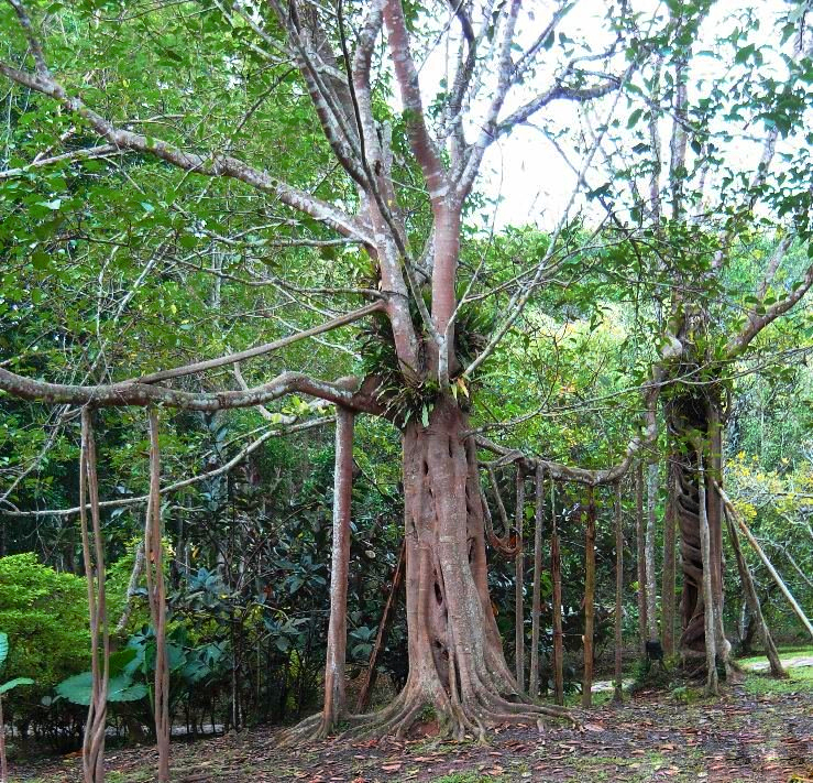 粗壯的大樹從半空向下伸出一條條氣根,在空中吸取陽光和水分,然後一頭栽進泥土裡,這片土地都是它的了,形成了獨樹成林的現象。