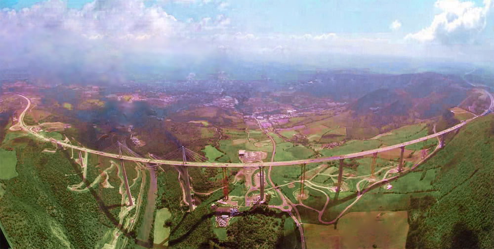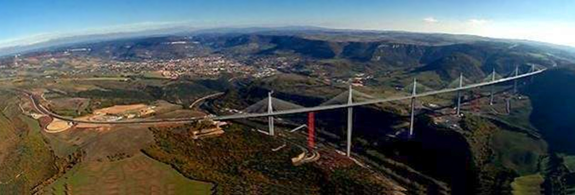米洛大橋位於法國南部,横跨塔恩河 Tarn River 深邃的河谷,連接巴黎到郎格多克海岸,米洛大橋延伸與西班牙巴塞隆納高速公路相連,舒緩了法國渡假時期往來巴黎和地中海沿岸地區的交通擁塞。