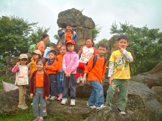 雨勢忽大忽小的落下,原先預定的山林探險,礙於濕滑的青苔石、泥土地不適合小朋友步行,順勢改為悠閒的林間漫步,大人們樂得徐行漫步,孩子們開始玩起路旁的花花草草,編織著花戒,好不愉快!往回走的路上雨勢停了,天空也豁然開朗起來,眺望遠處的山頭又是不同的風貌,孩子看著一排排的樹葉說:雨後的樹枝上好像掛起了一串串隱形的珍珠項鍊,真的耶,好美麗的珍珠項鍊啊!步行許久,小女孩喊肚子有點餓了,小男孩說:沒關係,我來煮一鍋石頭湯,立刻拾起地上的小石塊說「先放點香菇,然後再加點玉米粒」,接下來找來一些小樹枝,「加點蔥,還要給你補充營養,來塊大紅石肉喔!」一旁的孩子們見狀,也紛紛開始找起各種食材,有石頭蔬菜 、石頭豆腐…等等,漸漸的鍋內變得豐富起來,大人小孩們的歡笑聲迴盪在山谷。
