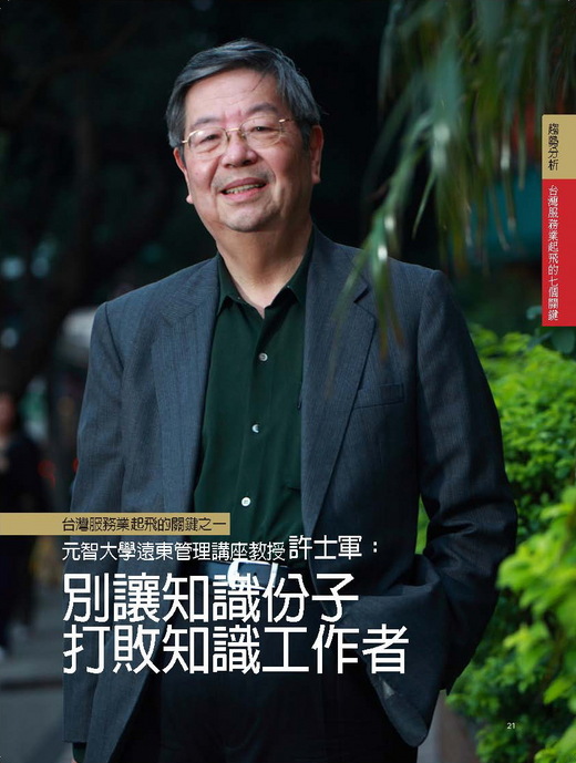 我最近寫一篇文章叫做」「知識份子打敗知識工作者」,就是說我國政府常找教授當作顧問,教授就以知識份子的身分為國家建言。知識份子不好意思和政府談價錢,他給多少就是多少,要做顏回。另一方面,知識份子也沒有組織來支持他,都是單槍匹馬去建言。波特(Michael Porter)去新加坡當顧問,三十年前就一天十萬美金,但他不是放進自己口袋,是請了很多人一起做研究,他的顧問工作才有品質。他們是知識工作者,我們只是知識份子,而且我們的建言品質差,因為沒有做研究。由於社會上不尊重知識,所以我們的知識服務業做不起來。