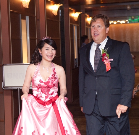 走進喜宴會場,己來了很多客人。招待人員引領我和小謝來到〝親朋 〞的桌位上。環視整個熱鬧的會場中,沒有看到其他任何外籍人士。聽朋友說:新郎、新娘己在美國辦過婚禮,新娘希望在自己家鄉,親朋好友前接受祝福,同時也讓新郎感受家人朋友的祝福。