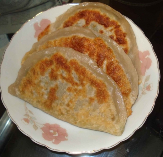 3.包餡:做法2的麵皮上放適量韭菜餡包起,可用盤子邊緣滾壓修成圓形,用平底鍋乾烙至呈金黃色即可。