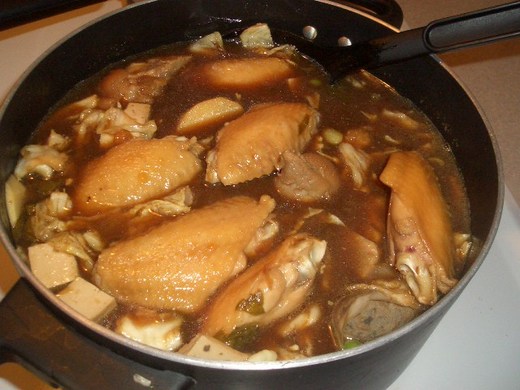 這次的滷味我有加 蹄髈+雞翅+米酒+之前用剩下的滷味汁+豆乾+兩顆馬鈴薯+綠色蔬菜+新的滷包+Add a few drops of soy sauce+ 適量的水+八角粉。這次的滷味沒弄滷蛋。麵是老公煮給我的,因為他把我的剩飯吃完了。