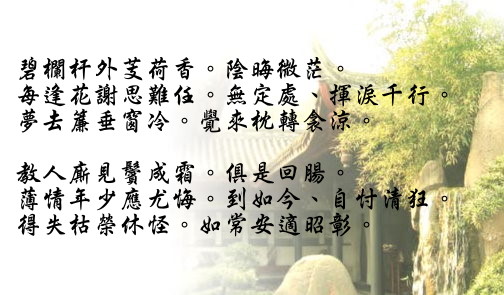 憑闌心冷斷愁腸。淚眼淒涼。蕭蕭殘雨當年事,鎖雙眉、不敵秋霜。