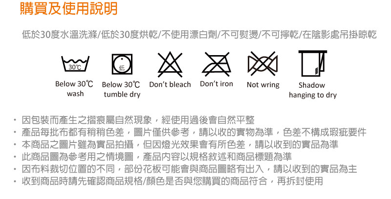 ★洗滌方式:低於30度水溫洗淨/不可烘乾/不使用漂白劑/不可熨燙/在陰涼處吊掛晾乾/建議搭配洗衣袋洗滌