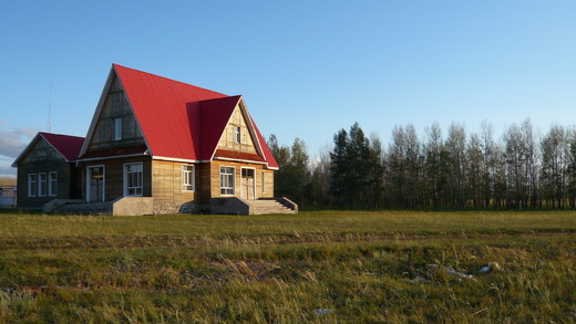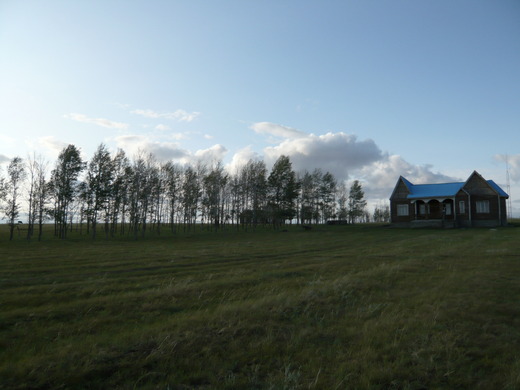 午後在大草原上散步還有一個驚喜,當我走在緩緩上升的坡面,不期而遇地撞見遠方地平線上有一片樹林,樹林邊有藍色屋頂和紅色屋頂的小木屋,藍色和紅色的屋頂在藍空白雲綠草的襯托下特別醒目,像極了童話世界中的森林小屋,非常歐洲的感覺。