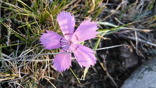 草地裡的粉紅小花,五片鋸齒狀花瓣相當勻稱,毫不保留地綻開,五片花瓣上的桃紅色圓弧線有志一同地向著花蕊圍成一個圓圈,特別引人注意。