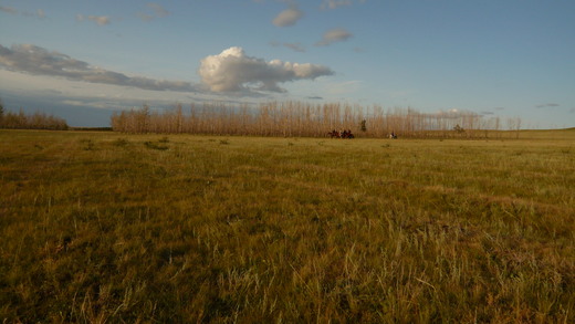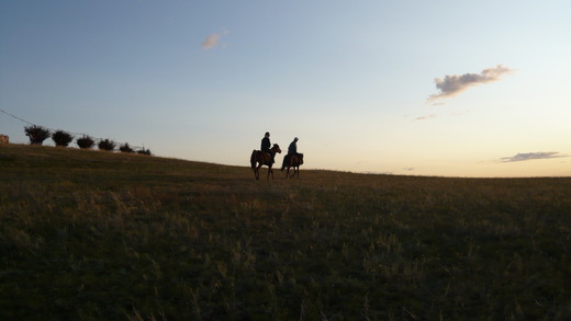 約莫下午四點,夕陽西下,我一個人在草原上遊蕩,碰見了一群馬隊,夕陽懸掛半空在白樺樹梢後忽隱忽現,白樺樹挺拔直立,樹葉早已飄落,稀疏且瘦骨嶙峋的枝幹一字排開,夕陽映照著馬隊,四、五隻馬匹點綴在前,簡直像是文學裡才會出現的畫面,就像是馬致遠的『古道、西風、瘦馬,夕陽西下、斷腸人在天涯』,秋天蕭瑟的景象清晰地顯現眼前。
