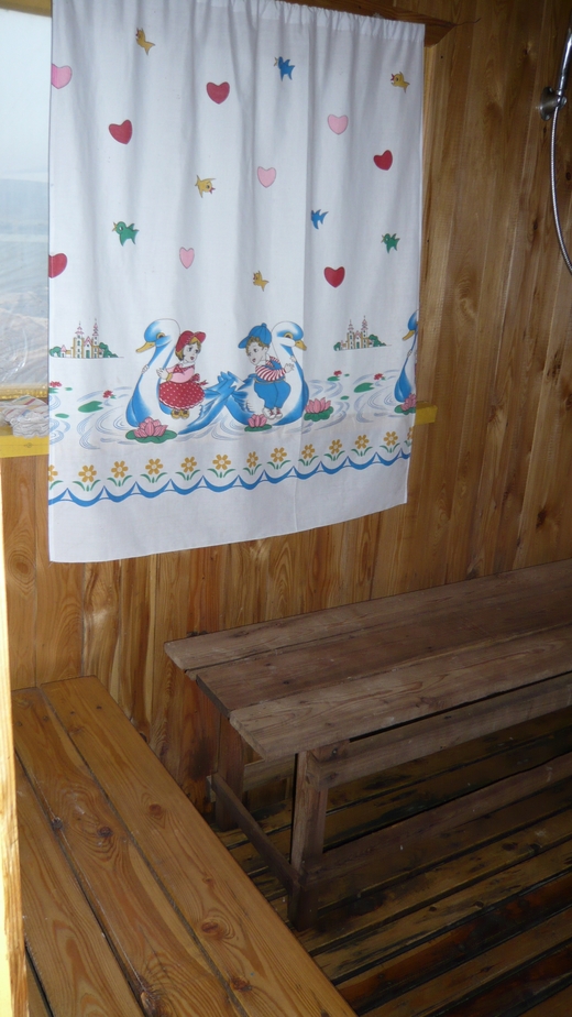 浴房中,一樣是原木打造的,曾幾何時我們又能在充滿芬多精的香氣中享用一旁石爐上正熊熊滾燙的熱水呢?看著蒸氣蒸蒸向上,最後一股暖意降臨在身上,俄羅斯族這樣的洗澡方式真是極大的享受喔!正享受暖呼呼蒸氣的我真想賴在這裡不走。