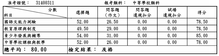 雖然,國文並不如我預期,對自己有點失望,大家都安慰過了就好,教師證上也不會印出分數,還是覺得可以更好啊......