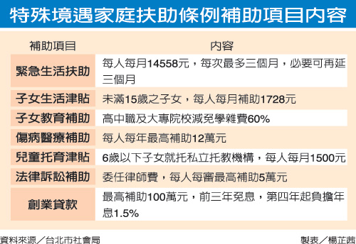 自3月1日開始實施的「特殊境遇家庭扶助條例」,首度將男性單親、隔代教養家庭納入補助範圍;台北市政府社會局昨天宣布,今年已編列一億元經費,可望協助2100戶弱勢家庭度過生活難關。