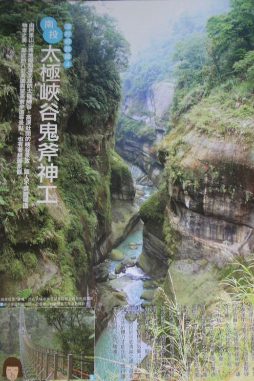 乘著一葉扁舟,沿著蜿蜒的河道前行,兩旁是高聳的峭壁環繞,這是白居易早發白帝城詩裡「兩岸猿聲啼不住,輕舟已過萬重山」長江某一段的壯麗美景。位於南投竹山鎮的太極峽谷,因河道較窄,水流湍急,雖無法享受乘著輕盈的扁舟,滑過河道欣賞美景的愜意,但壯麗的峽谷美景,仍讓人有如身處仙地祕境的錯覺!