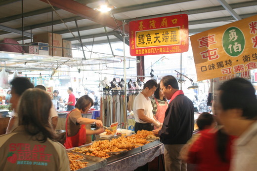 再來就是台中縣大里的黃昏市場了,裡頭可說是應有盡有阿!這個市場是以棚子搭建的室內市場,不用擔心外頭風雨交加,人客可以悠哉慢慢得逛,什麼美食都有,香味四溢的烤鴨、大片大片的古早味大餅、配料超多好像不用錢的古早味豆花、有時還會有現做的手工披薩(一片69元超平價)到此叫賣、還有北部的美食天婦羅…,口水都快滴到鞋子了!我曾經有好幾頓晚餐都來此享用,種類超豐富,讓你連續來吃ㄧ個禮拜都不嫌膩!