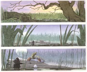 我們看《瘋狂星期二》開頭的第一幕:「星期二晚上快8點」,領頭由遠推近,一隻烏龜抬起頭來,然後翻頁過來,一群青蛙低空撂過烏龜的頭頂,嚇得烏龜縮頭。這一段情節如果碰到不好的畫家會怎麼畫?通常會畫遠遠一堆小點,慢慢拉近,青蛙越飛越近,越變越大。這樣做就沒有「好奇」,也沒有翻頁後的「驚奇」。