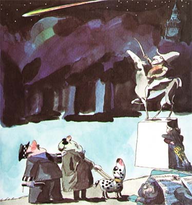 怪獸發現了地球,發現了有個小孩叫阿湯,看起來很好吃。鏡頭轉到阿湯正在壁爐前,聽大人講怪獸的恐怖故事,這裡故事開始進入「雙線」。接著跳回怪獸的太空船,船上螢幕出現地球,怪獸接近了。然後一道光束,劃過夜空。公園裡的人都抬頭看著光束,湯尼羅斯巧妙的用人的目光,集中在天邊一角的光束,自然的引導讀者目光聚焦在太空船上。所以不管我們讀到這一頁時,眼睛落在畫面的哪一部份,我們都會隨著創作者安排的指示,被帶到他要我們看到的劇情。這一幕也看出湯尼羅斯的幽默,雕像的馬頭、劍稍都指向太空船,幽會的男女、流浪漢、警察、導盲犬,連戴墨鏡的瞎子也抬頭看,是真瞎還是假瞎?