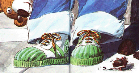 翻頁後,結局出現。沒有文字,創作者要讓我們自己去發現。原來怪獸和阿湯比起來,是比球鞋還小的小不點,所有的恐懼在瞬間,快樂的消失。這個交會的驚奇,是靠前面給我們不斷的暗示,怪獸好像很大,他用我們腦中既有的思惟,星球是大的,吃星球的怪獸當然也大……來製造錯覺。畫面的交叉出現,讓我們更加深這個錯覺,最後交會出驚奇幽默的效果。湯尼羅斯的畫面,簡潔有力,速度感十足,加上他一貫幽默的趣味,每次他處理有關孩子面臨的難題,如害怕,不想上學……都給我們無限的驚喜,難怪小朋友能在他的作品中,找到最大的抒發空間。