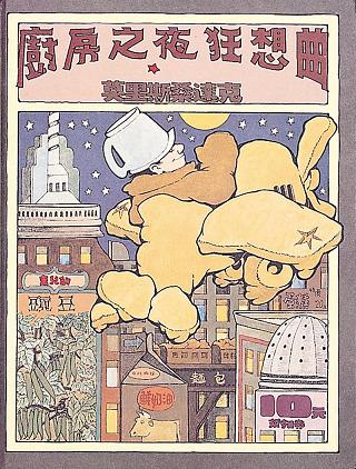 另一個出色的創意,是桑達克把紐約融在廚房中,用廚房的器物代替大樓,創造了一個超現實的紐約天際線。繪本中間的大跨頁美得令人迷惑。藍色的午夜天空中繁星點點,一列麵包火車呼嘯而過,各式各樣的紙盒、紙袋和瓶子,構成一個美麗的大都會仿製品。頁面上最突出的景物,便是位於最前方的牛奶瓶,米奇正是從這個牛奶瓶中取得一杯牛奶來做麵包。