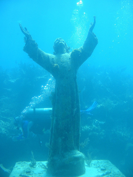 近期海底街景計畫在佛羅里達礁島群保護區的收穫,令人驚喜;照片中可以清楚看到海底沉船、千萬種的魚類和8英呎的基督銅像。該銅像名為「深淵中的基督像」,在1965年左右沉入海中,基督被珊瑚礁覆蓋的手伸向水面,是全世界最受歡迎的海底潛水景點之一,如今透過Google map,付不起昂貴旅費出國潛水的人也可以輕鬆看到。