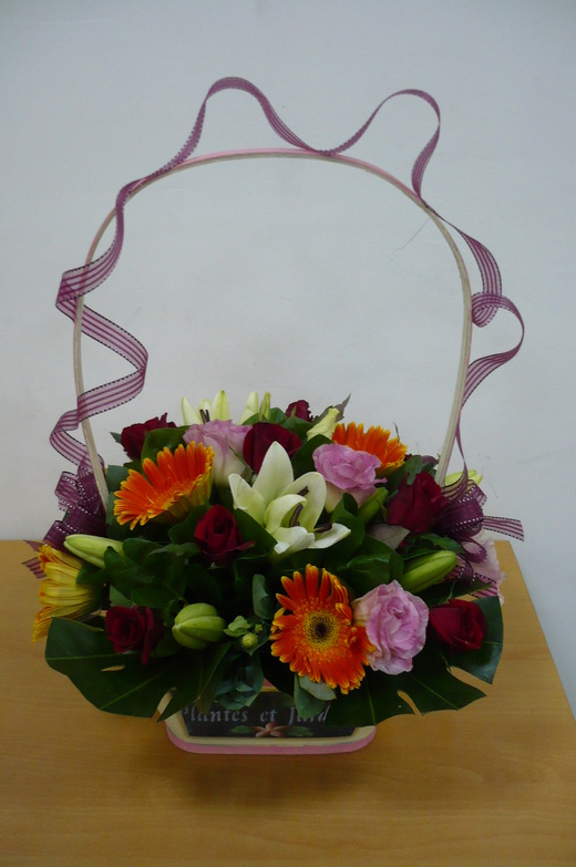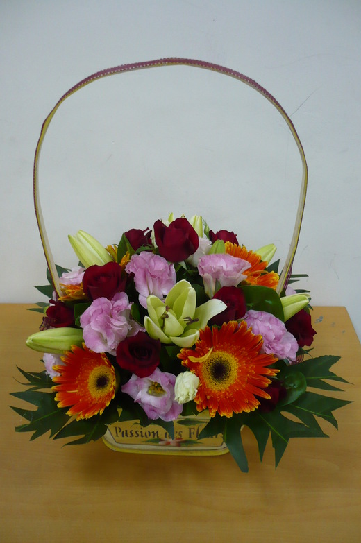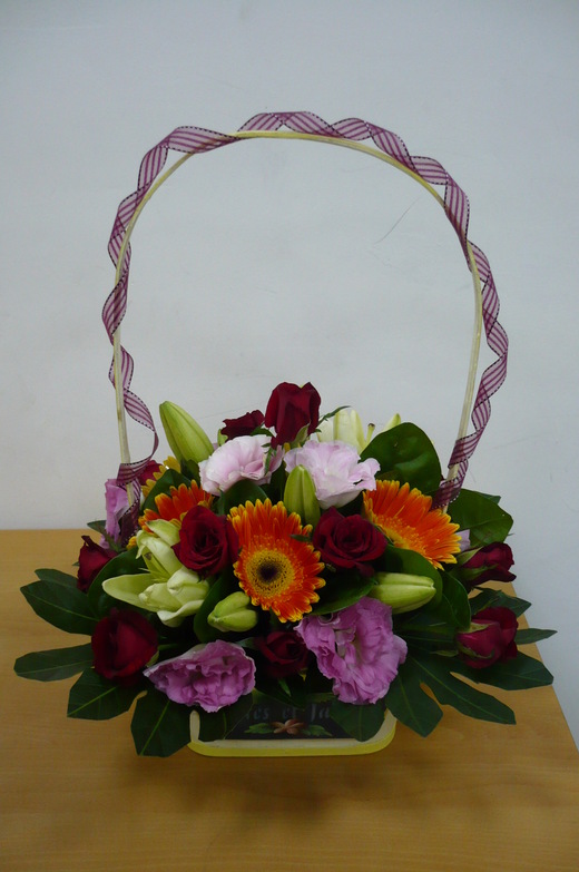 花材:太陽花*5、百合(LV)*2、紅玫瑰*9、桔梗*2、八角金盤*4、
