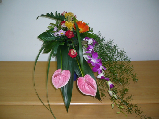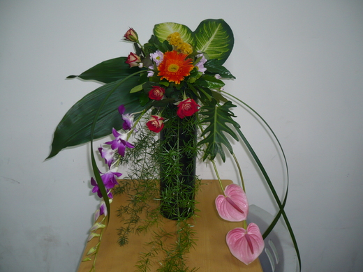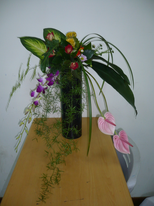 花材:火鶴*2、石斛蘭*1、天門冬*2、雞冠花*2、太陽花*1、冰火玫瑰*5、