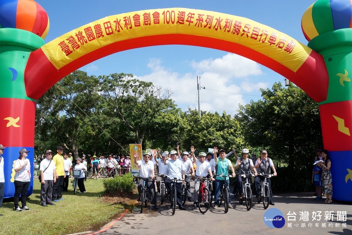 桃園農田水利會慶創會100週年系列活動中的「水利騎兵」單車遊水圳埤塘風光15日上午於觀音區崙坪文化地景公園盛大登場,全程活動由會長黃金春、總幹事黃金德共同主持,桃園市長鄭文燦在鄭文燦在市府農業局長郭承泉台南市搬家客家局長何明光的陪同中與會、立法委員吳志揚、市府前市政顧問立法委員參選人黃世杰等人也到場參加。
