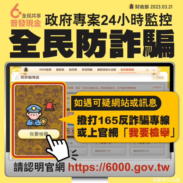 全民共享普發現金宣導網站(https://pro.6000.gov.tw)並已設置防詐騙專區,提供民眾防詐騙資訊、影片、懶人包等資訊,該網站亦提供內政部警政署165全民防騙網(https://165.npa.gov.tw)連結供民眾檢舉使用,以達政府行政作業一致,且可即時通報警政署,加速案件處理。