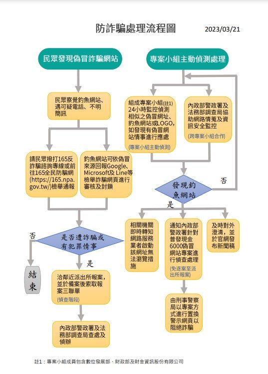 如民眾收到釣魚詐騙網站訊息、可疑電話或不明簡訊,可撥打165反詐騙諮詢專線或前往165全民防騙網(https://165.npa.gov.tw/)檢舉通報;釣魚網站資訊亦可透過使用之瀏覽器或手機App檢舉回報至google、microsoft或Line 官方系統進行審核及封鎖,以防再有民眾受騙。如確實遭受詐騙,可直接洽鄰近派出所報案並於備案後索取報案三聯單,後續將由內政部警政署及法務部調查局查處並進入偵辦程序。