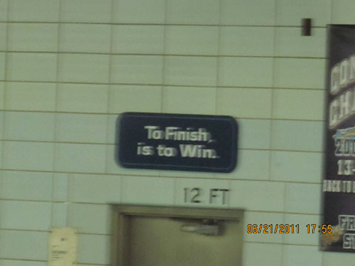 當我在等待開始的時候, 無意抬頭一望, 看見一個 sign, 寫著"To finish is to win", 寫得絕對正確. 每個人都希望自己在比賽中是第一名, 但可惜第一名只得一個. 我常常這樣想, 為著名次去比賽不是最好的教育方法, 雖然朋友話, 為了贏取第一名就會盡力, 只可惜盡了全力也不代表會是獨佔鰲頭, 那時候, 失望, 傷心也許還是最大. 不是問輸贏而是問我盡力否? 如果盡其所有去做每一件事, 無論結果是什麼都值得驕傲.