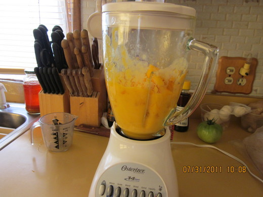2. 把一半的芒果粒和鮮奶, 半罐柳橙放入攪拌器攪混, 然後傾倒入容器