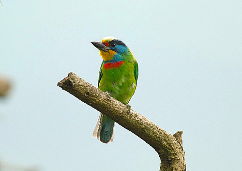 不擅飛行,常會靜立在枯 枝上,或是停在喬木的中上層枝葉間。五色鳥擁有良