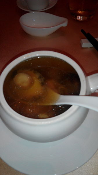 第二道上桌是一盅熱湯品「蛹蟲草紅棗燉鮑魚」,一顆完整的