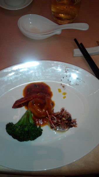 第三道是乾煎大明蝦,白色圓盤上用巧克力醬點畫出一隻可愛