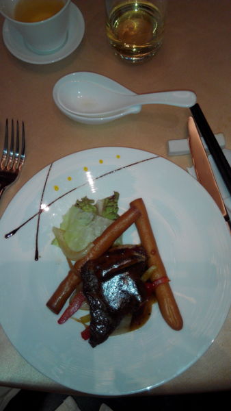 第四道菜則是蜜椒香草煎牛排,盤中配以兩根如火腿的食材,