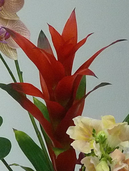 粗花梗,花梗上日生披針形紅色的鮮艷總苞,觀賞期持久約有半年。