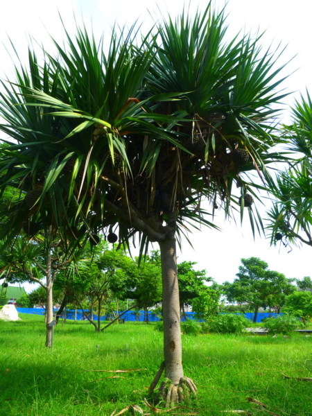 公園另處開闊的草皮上,則散落著幾顆熱帶植物—紅刺林投,頭
