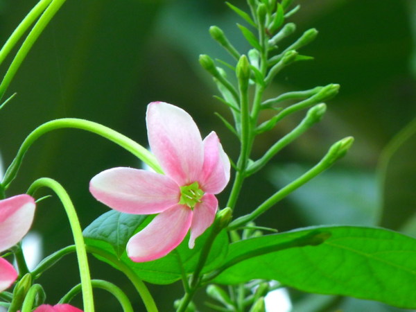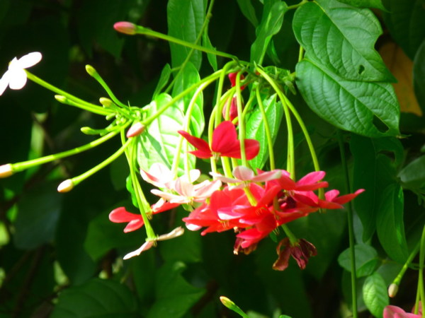 公園這方天地,一邊是綻放鮮紅或粉紅花序的使君子,美麗的花朵襯
