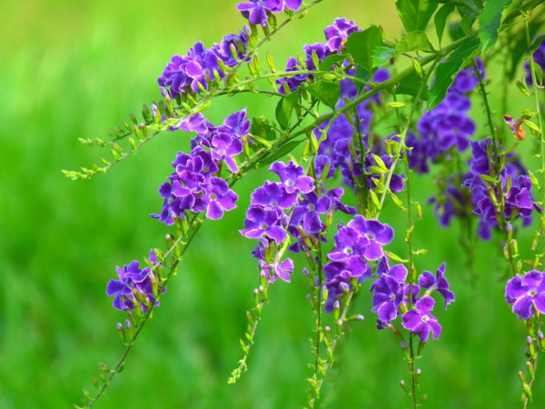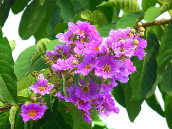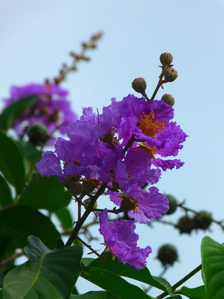 站立著,身上披掛著鮮豔奪目的紫色花瓣,映著藍色的天空,更加