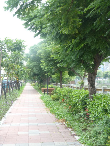 磁磚步道及木造的景觀平台,許多年輕的慢跑者或年長的老先生、