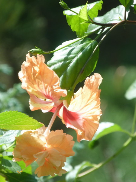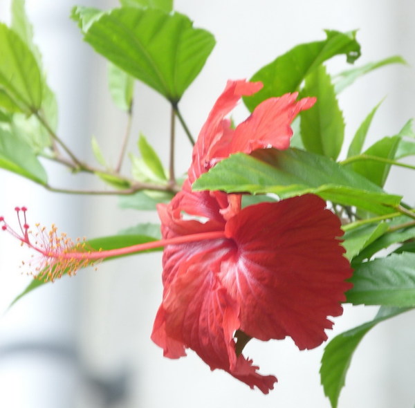 火紅的扶桑花被秋風吹得花枝亂綻。