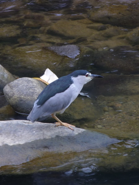 有披著藍色外套的夜鷺站在水中岩石上,虎視眈眈;