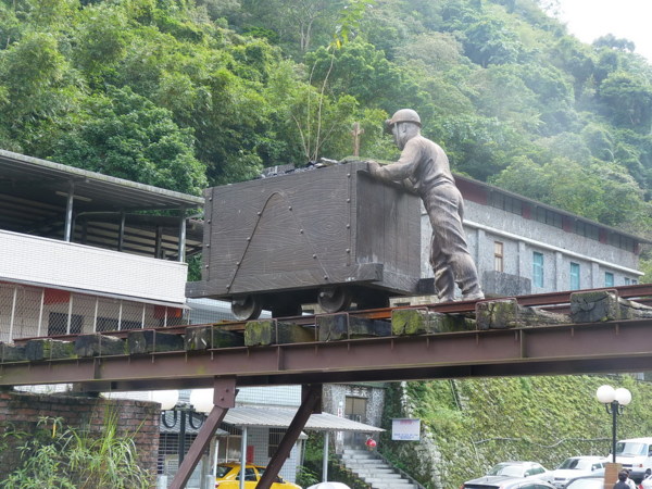 看見河床上有座推著煤礦車的礦工雕像,像在述說石碇的
