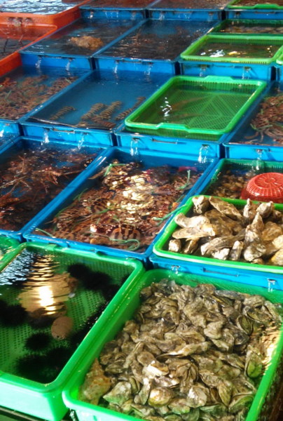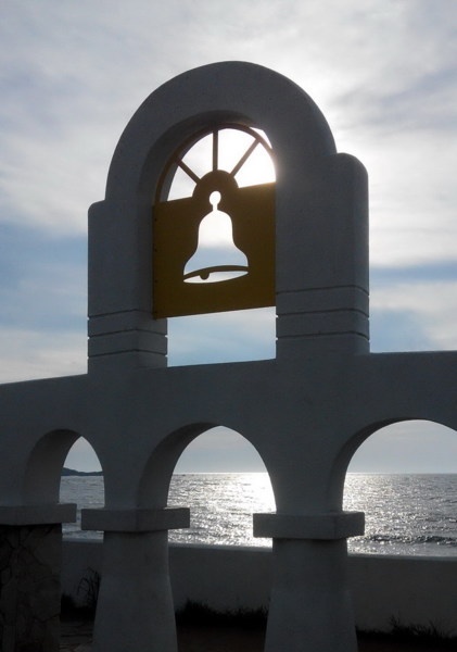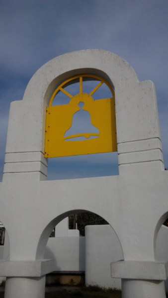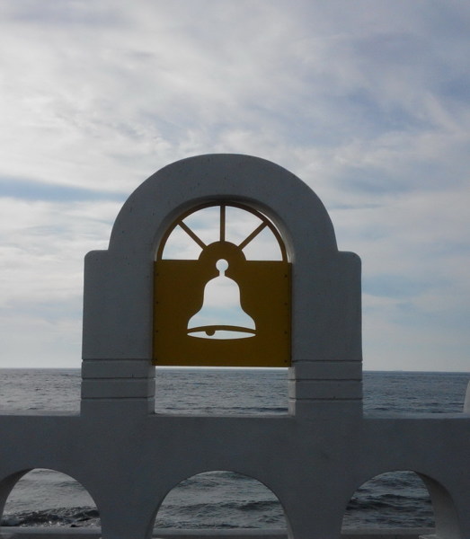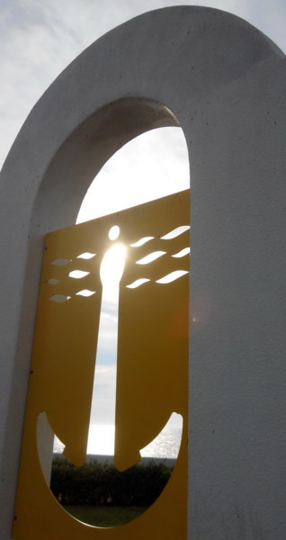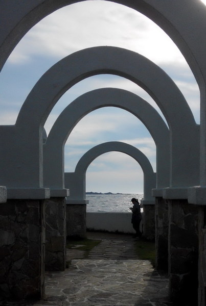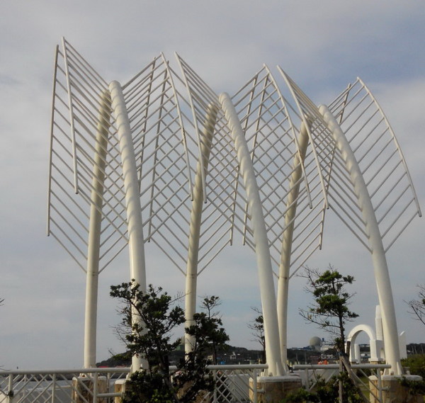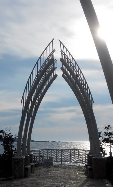這兒有像是羽毛的鋼柱架成通往海裡的拱門