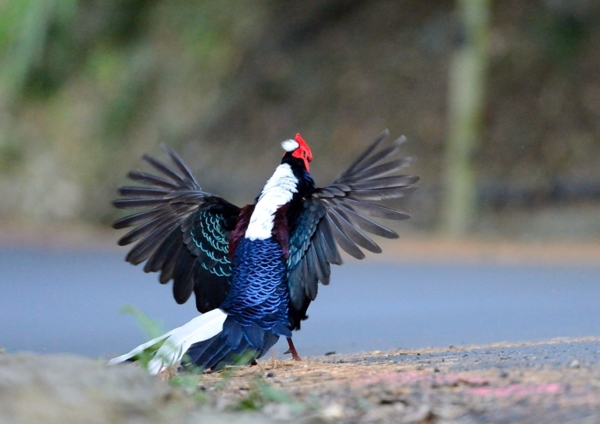 有在清晨或黃昏才容易觀察到牠踱步於森林小徑。藍腹鷴的求偶
