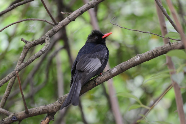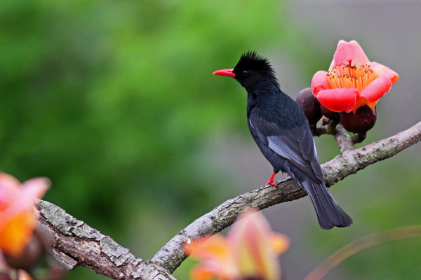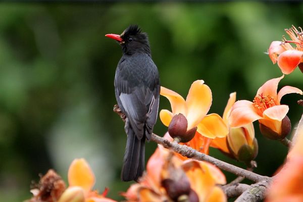 紅嘴黑鵯,通常棲息於海拔一千公尺以下山區,體長約24公分,