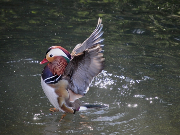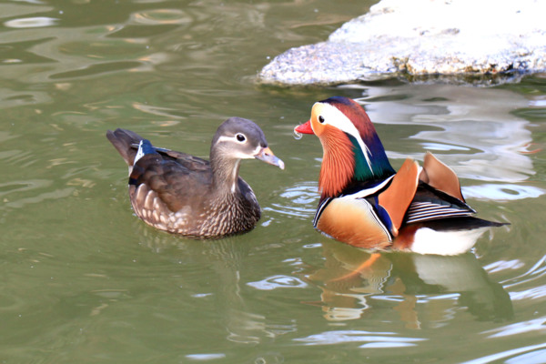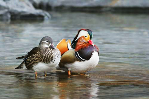 體長約45公分,雄鳥(鴛)羽色豔麗,嘴喙橙紅色,眼環白色,並向