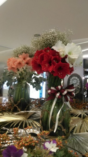 玻璃罐中放入孤挺花與滿天星,玻璃罐上綁上美麗的蝴蝶結緞帶,這部分